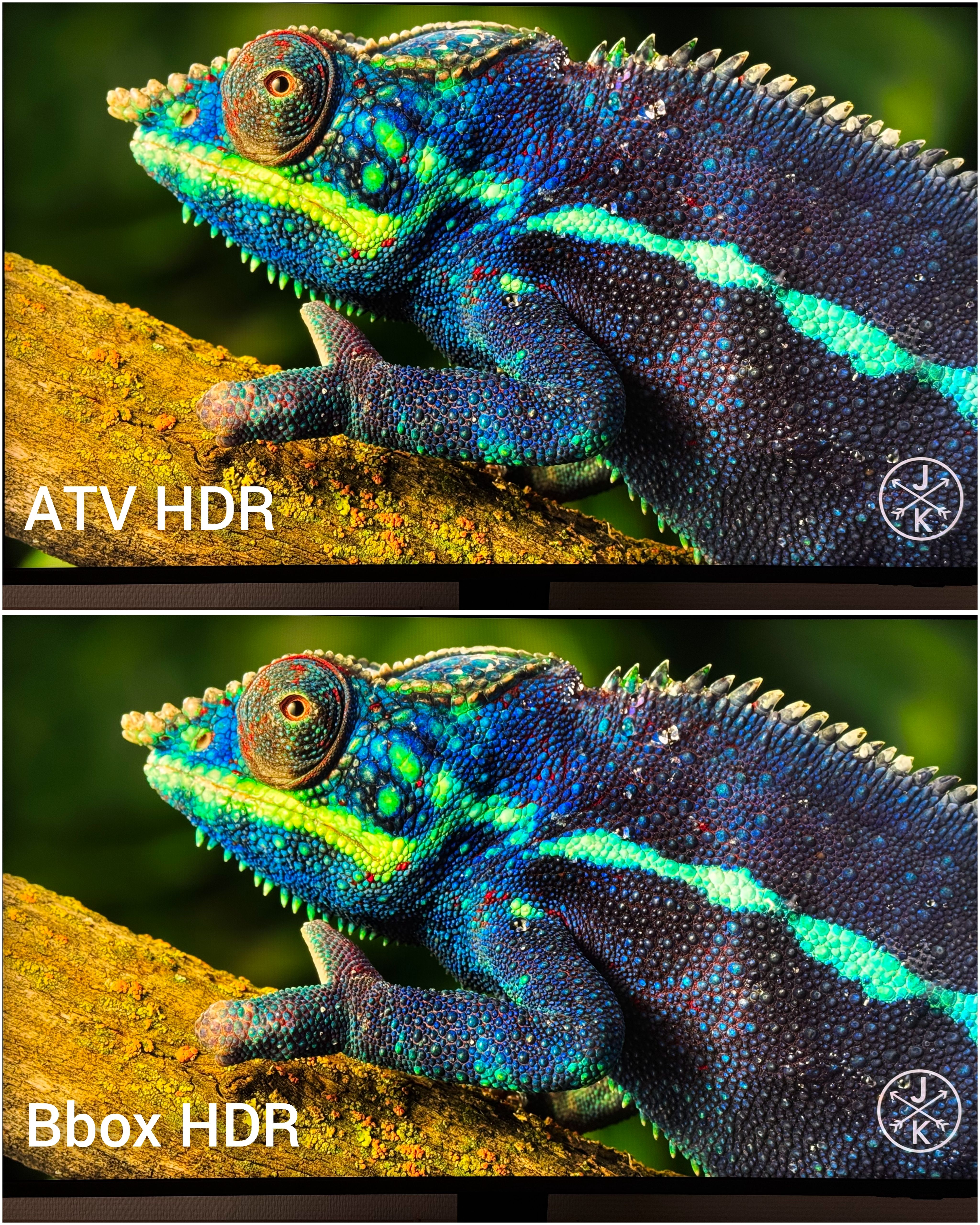 En fait, il y a une solution encore plus simple: YouTube. J'ai lancé la même vidéo sur l'application YouTube du décodeur et de l'Apple TV et j'ai pris des photos avec le même niveau d'exposition sur toutes les photos, même balance des blancs, etc. (iPhone 15 Pro en mode manuel sur trépied).