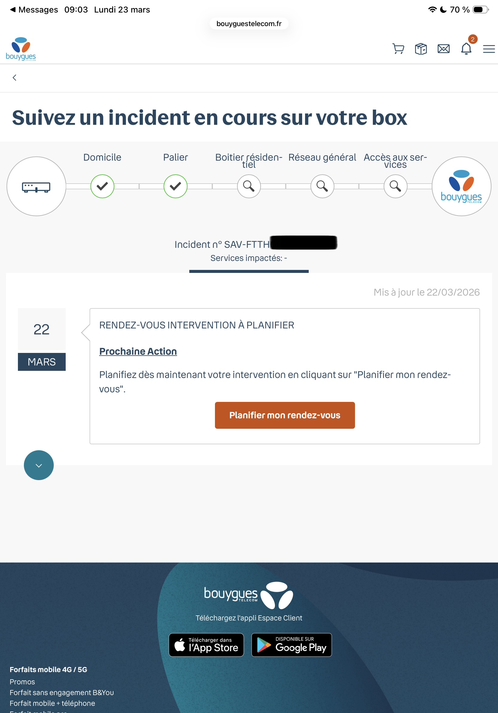 L'automate de Bouygues m'a envoyé un SMS m'invitant à fixer un rendez-vous technicien (comme on peut le voir sur la capture d'écran).