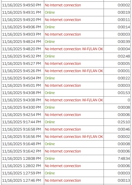 Ci-joint les logs pour le dimanche 16 novembre qui était une journée typique, à 21h50 j'ai craqué et j'ai basculé en 5g avec un partage de connexion usb qui était parfaitement stable.